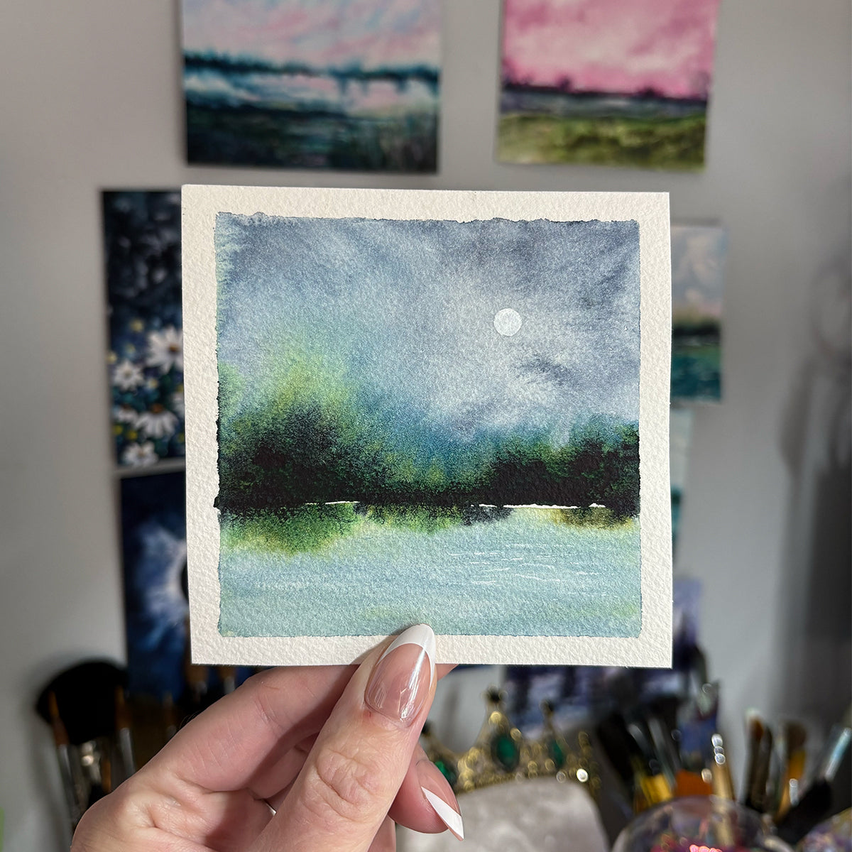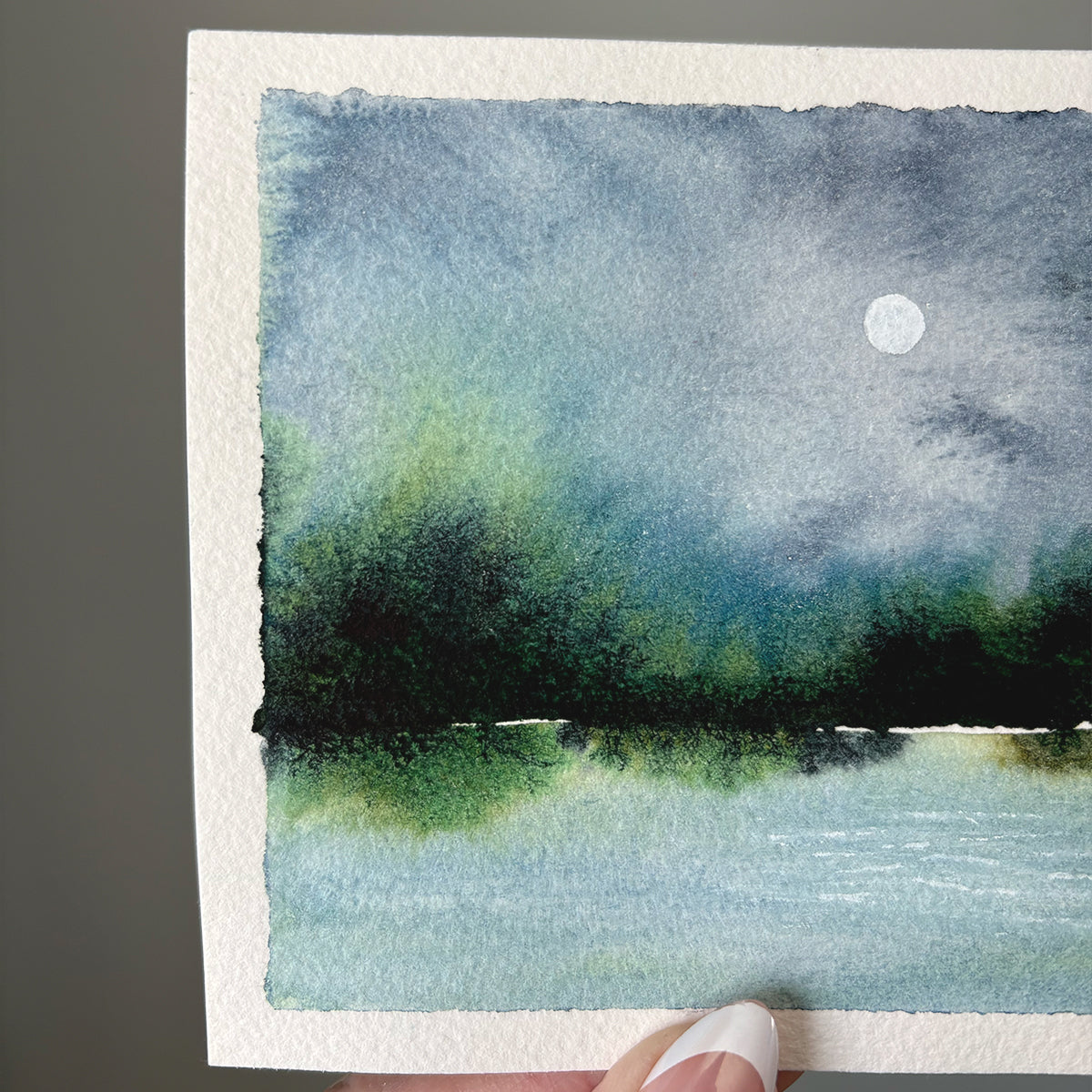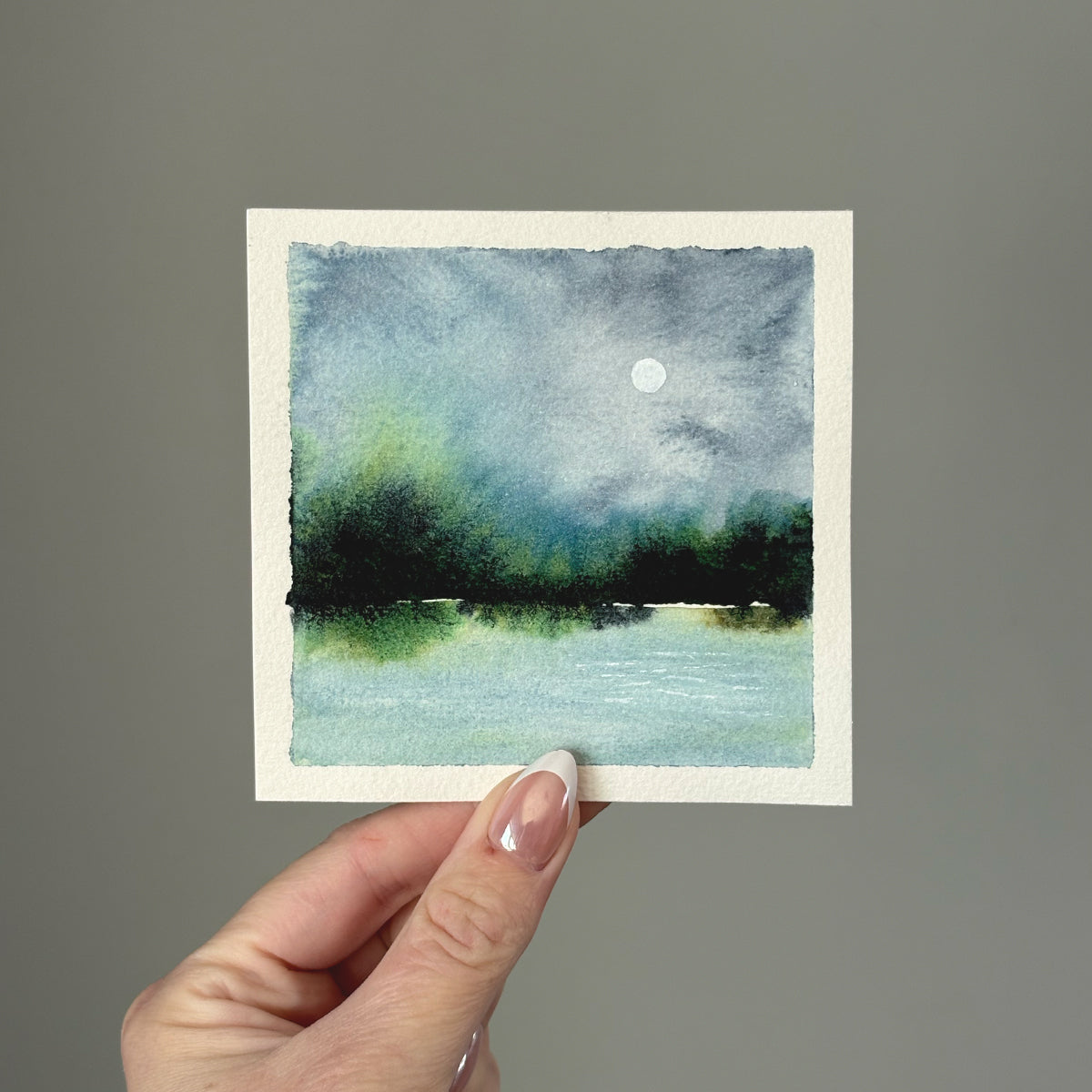 This simple watercolor landscape features a bold horizon and a soft full moon. A beautiful mini painting to display anywhere.